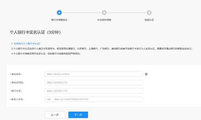 个人实名认证有2种认证方式:分为个人银行卡认证和身份证人工审核认证。具体操作可参考以下指导视频和指导文档。