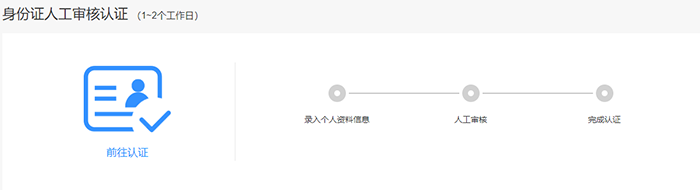 | 个人 | 人工审核 | 1.身份证原件正反面扫描件或照片 2.手持身份证正面照片 |