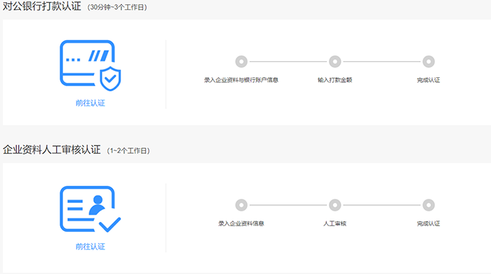 企业实名认证有2种认证方式:对公银行打款认证和企业资料人工审核认证。具体操作可参考以下指导视频和指导文档。