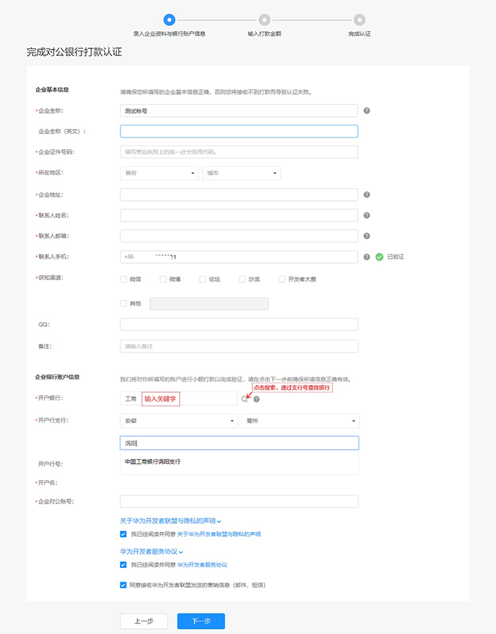 企业的基本信息和企业银行账户信息填写完成后,签署《华为开发者联盟与隐私的声明》和《华为开发者服务协议》,点击“下一步”,系统会发送邮件和短信通知您已发起打款申请。通知发出后30分钟~3工作日内,联盟尾号为0505的账户将向您提供的银行账户打一笔小于1元的款项。