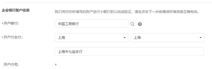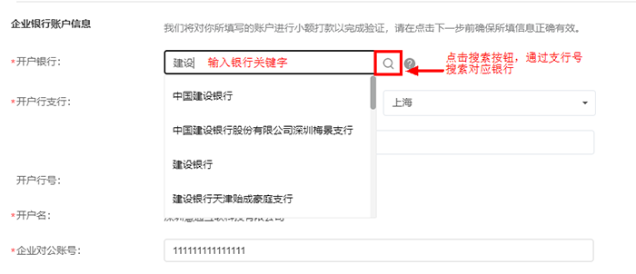 方法一:在“开户银行”输入框里输入关键字,系统会匹配出含有关键字的银行信息,在下拉菜单中选中您的企业银行后,系统自动把银行名称填充到输入框内(如建设银行,请输入“建设”),银行信息填写完成。填写支行信息操作同开户银行一致。