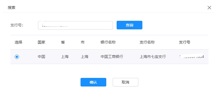 方法二:点击“开户银行”后面的搜索按钮(如上图),进入银行搜索页面。输入支行号点击查询,选中查询出的支行,点击“确认”系统自动把银行名称填充到输入框内,银行信息填写完成。