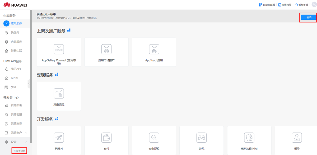 开发者可以在“管理中心” > “设置” > “开发者信息”查看已验证的身份信息。