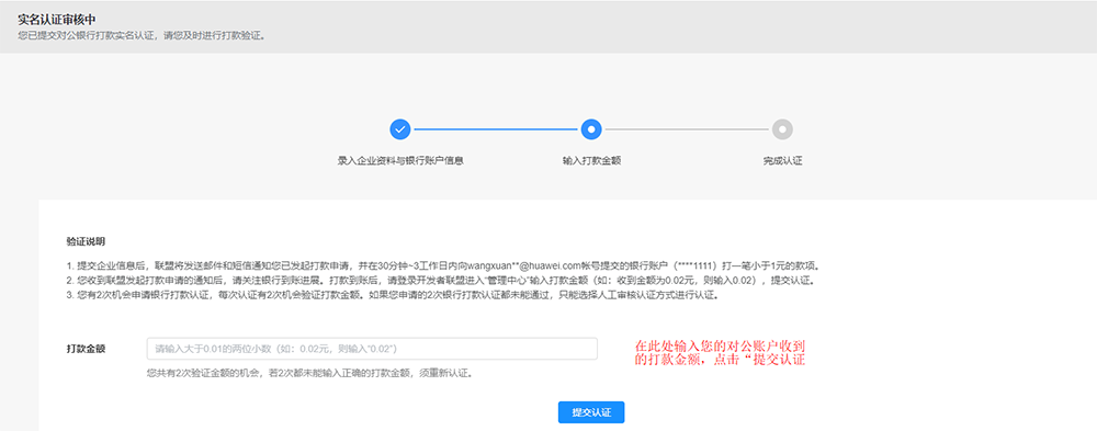 输入打款金额后,点击“提交认证”,系统自动审核。如您填写的金额正确,实名认证通过;如填写的金额错误,实名认证被立即驳回。