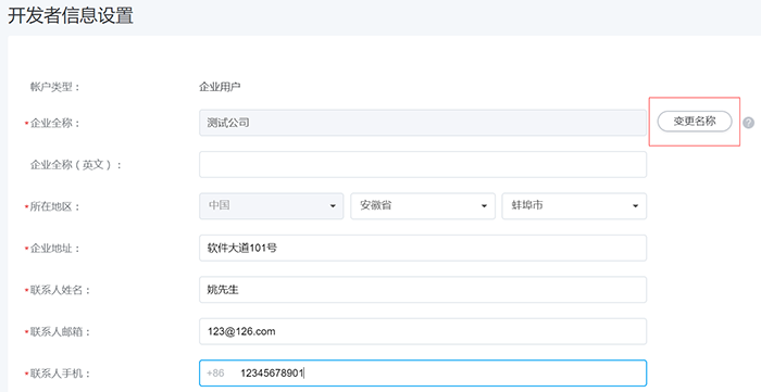 1. 在“开发者信息设置”页面点击“变更名称”,上传相关资质提交审核。