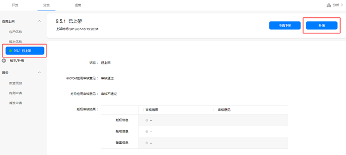 第二步:左侧导航选择“版本信息”下已上架待更新的版本,进入版本信息界面,点击右上角“升级”。