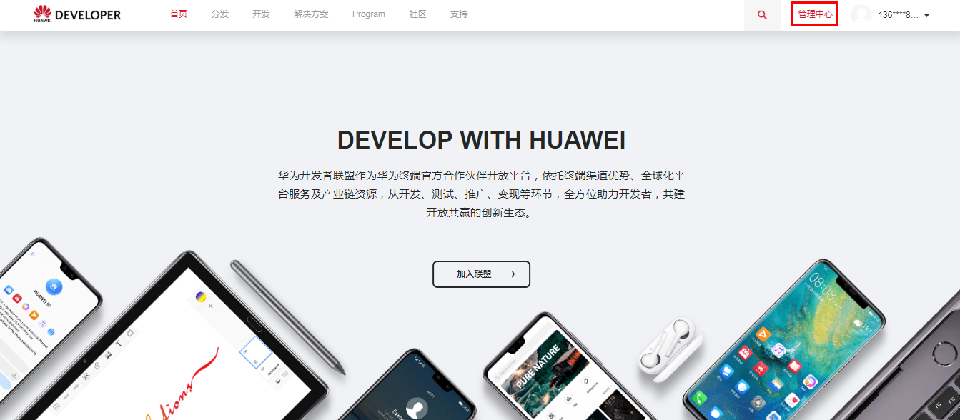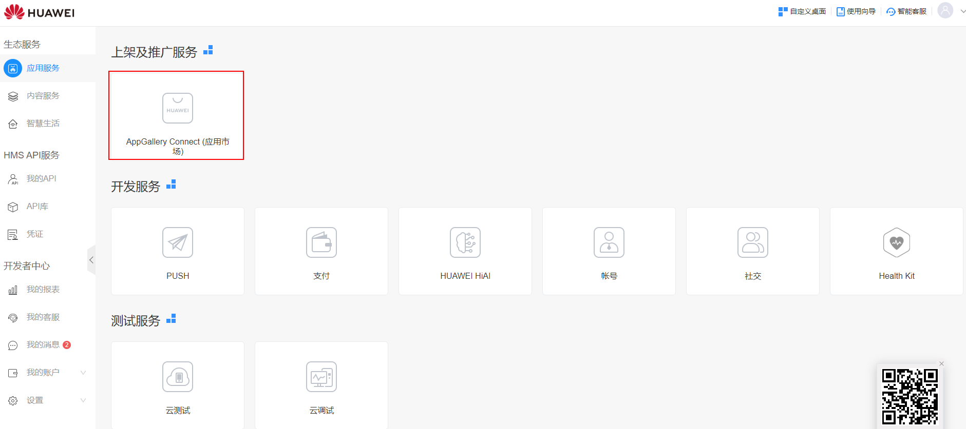 1、点击“管理中心” > “上架及推广服务”页面,点击“AppGallery Connect(应用市场)”。